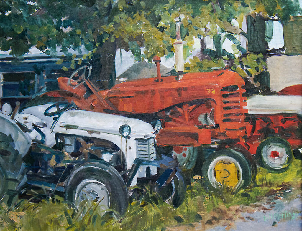 I painted "Tractors in Red, White, and Blue" during the 2021 Hudson Valley Plein Air Festival. These tractors are located in a field across from Chambers Tractor Sales in Montgomery, New York. There are dozens of tractors there, as well as a practical museum of tractors (the Farmers Museum), which is dedicated to the historical importance of agriculture to the area and reflects the general patriotic spirit of the town. ~ W.M.